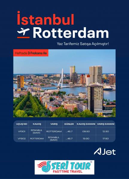 İstanbul’un tarihinden Rotterdam’ın fütüristik sokaklarına doğrudan bir yolculuğa ne dersiniz? Yaz tarifemiz satışa çıktı! Kübik evleri ziyaret etmek, Erasmus Köprüsü'nde yürüyüş yapmak ve Hollanda’nın dinamik atmosferini solumak için plan yapmanın tam zamanı.